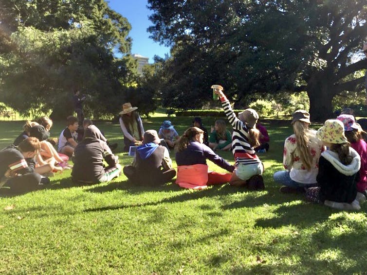 A girl volunteers her opinion in a group discussion at Sydney’s Royal Botanic Gardens.