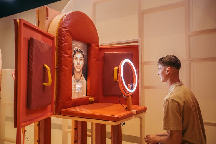 You are invited to gaze into a mirror which scans your face. From this scan, the algorithm creates a profile of your age, gender and personality, which appears as statistical data overlaid on your reflection.