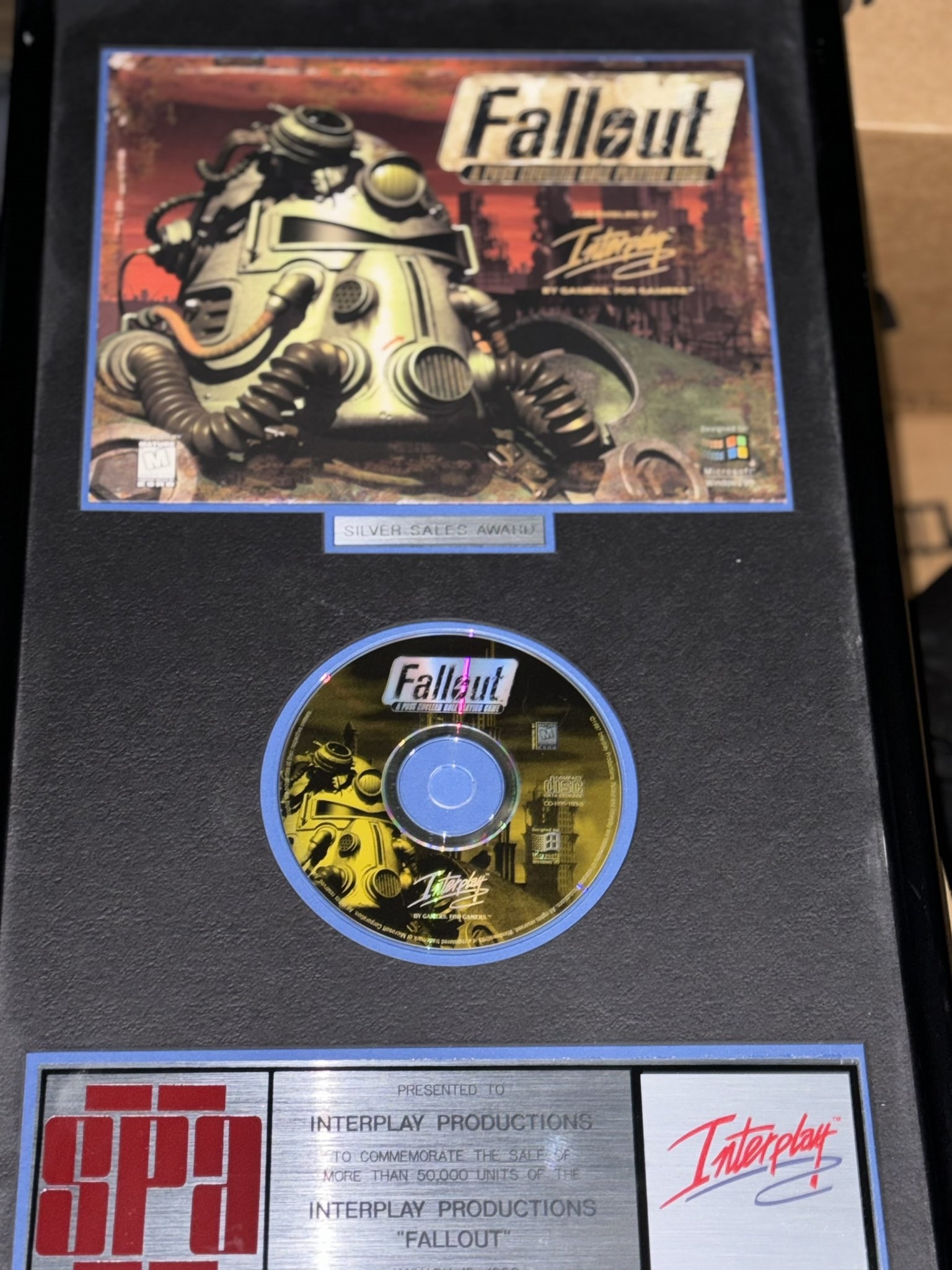 First though: The trove itself. Most of the items Fargo showed off were sales awards for various Interplay games from the Software Publishers Association (now the Software and Information Industry Association) of “Don’t Copy that Floppy” fame. The OG Baldur’s Gate plaque, meanwhile, came from the Consumer Products Council, a decidedly less musical industry body.