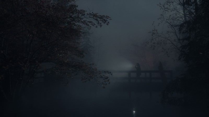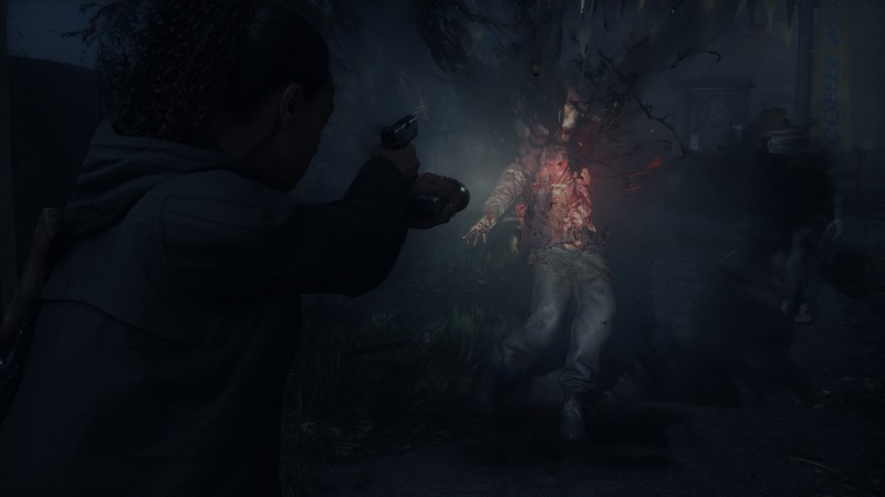 As I traverse an eerie forest path to the park, I get my first taste of combat as a shadowy speedster attacks. The over-the-shoulder gunplay feels good, with weapons such as my pistol and shotgun packing a satisfying punch. I’m reminded of Resident Evil 4’s action as I side-step incoming hatchets the enemy throws while firing shots. Nailing headshots is tricky as my pistol doesn’t sport the greatest accuracy; thankfully, you can improve this attribute and others in the Mind Map’s weapon upgrade menu. Of course, holding a shoulder bumper to concentrate your flashlight beam can render these shadowy threats more vulnerable to gunfire.
