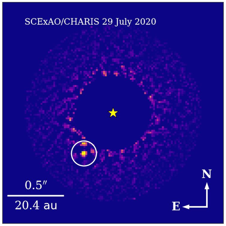Images of the HIP99770 system, taken with exoplanet imager SCExAO (Subaru Coronagraphic Extreme Adaptive Optics Project) coupled with data from the CHARIS instrument (Coronagraphic High-Resolution Imager and Spectrograph).