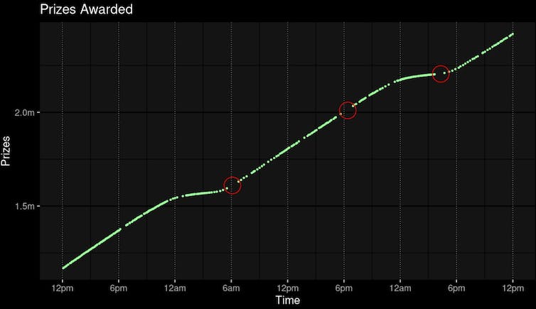During this two-day period the number of prizes awarded continued to climb, with the win rate slowing during the nighttime hours. Gaps in the data can also be seen. All times Eastern.