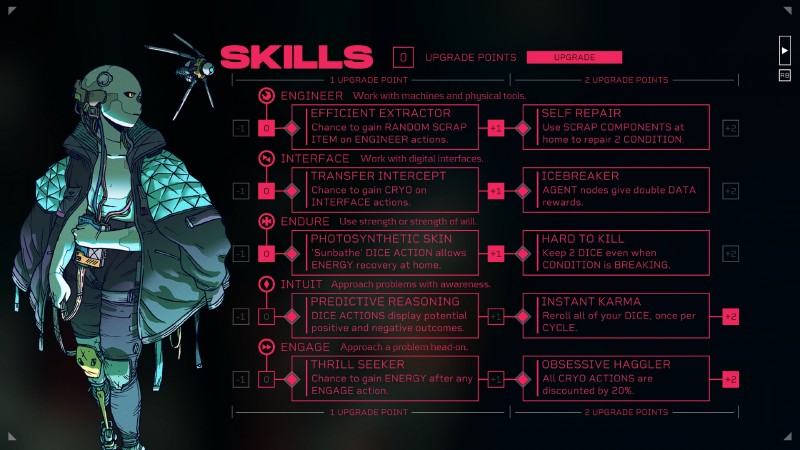 Citizen Sleeper uses these moments to take me through every throe of capitalism, which is the true antagonist in developer Jump Over The Age’s story. When I first arrived, I struggled to make it through one cycle without feeling completely overwhelmed and unseen. I couldn’t make money, so I was unable to buy food, which was necessary to keep my energy up. As a result, my health quickly worsened, and because of this struggle, I couldn’t afford medicine. This built on itself until I hit rock bottom, which locked me out of one of my Sleeper’s core abilities displayed on a sleek skills screen. I could only unlock it with an upgrade point, which is earned after completing main objectives. But, to accomplish that, I needed some great dice or at least multiple dice. With my condition in the dumps, getting either felt impossible.