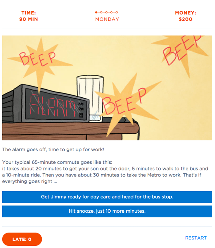 The problems facing players align with real-world trade-offs the reporter found people making: Should a worker choose a pricey ride-share service to get to the daycare in time for pickup or save money by taking the train but risk incurring fees for being late? Should a worker trust the announcement that the train will be only 15 minutes late or decline an extra shift because of rail service outages? Players have to balance their family, work and financial demands, in hopes of ending the week without running out of money or getting fired for being late to work.