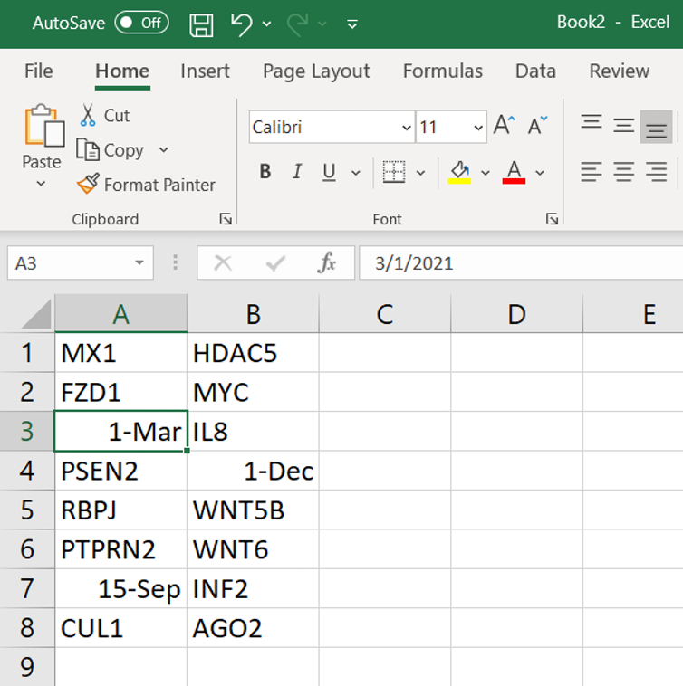 An example list of gene names in Excel.