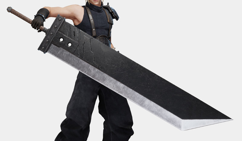 Dai Suzuki: Weapons also have more polygons due to the increased detailing. The Buster Sword has a simple design, but most of the polygons were used around the materia slots and the leather wrap around the handle. The materia that attaches to the weapon also has mesh on the weapon side, and out of the 8,000 polygons, approximately 1,000 polygons are used for the two materia slots.