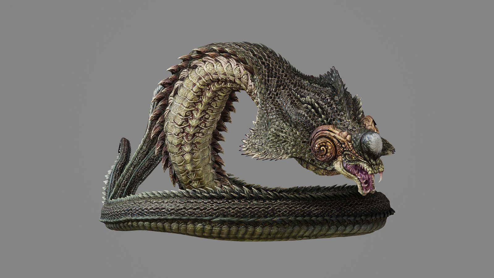 Dai Suzuki: Next, let’s take a look at the modeling of the monsters. Midgardsormr’s numerous spikes are modeled all the way down to the tip of its tail. These spikes, which were absent in the original version, make its silhouette even more menacing. These details play an important role in conveying to the player the feeling of incurring lots of damage from the spikes when the creature lashes its large tail.