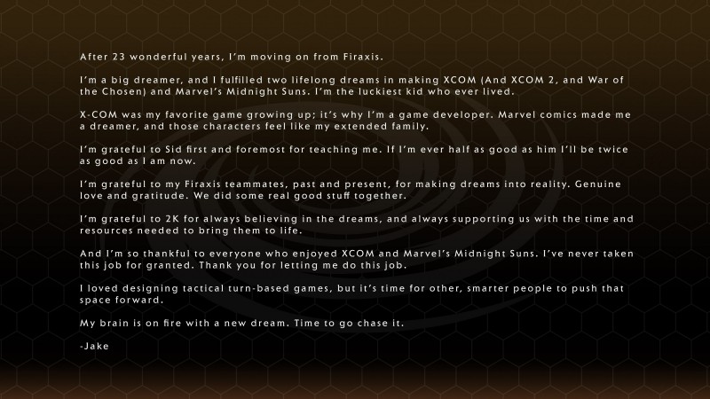 And I’m so thankful to everyone who enjoyed XCOM and Marvel’s Midnight Suns. I’ve never taken this job for granted. Thank you for letting me do this job.