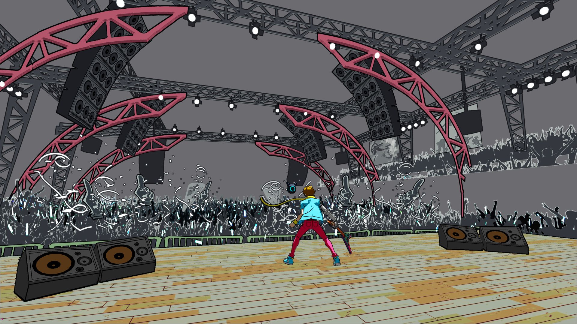 One thing that I was set on from the beginning was focusing on rock music and non-electronic music… I wanted to capture the feeling of playing a guitar chord with a live band and that roughness to it. Not like the perfect accuracy of a digital music track or something like that. And it just kind of fits for a brawler, that sort of rock feel. And I grew up listening to rock, which was more of a personal thing, but I just thought that it was a little weirdly unrepresented in the gameplay experience sense.