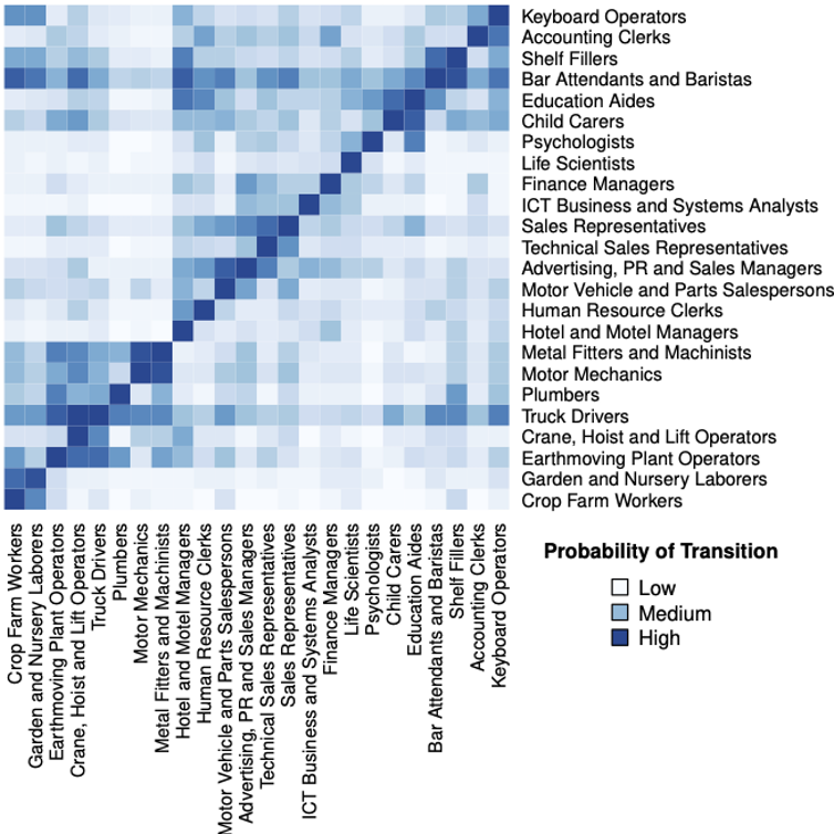 If you look at a given occupation at the bottom of the map, the column of squares shows the probability of moving from that occupation to the one listed at the right-hand side. The darker the square, the higher the probability of making the transition.