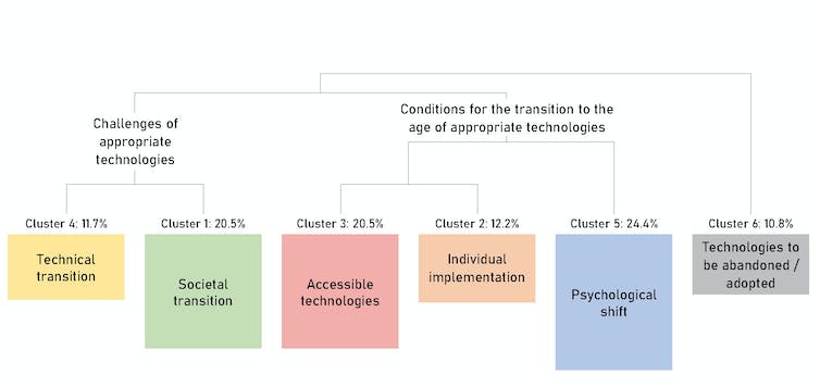 The public’s representations of appropriate technologies based on a textual analysis. In addition to technical issues, appropriate technologies must respond to a societal transition issue. To make this transition toward the wider use of appropriate technologies, the participants mainly identify obstacles related to accessibility and ease of use.