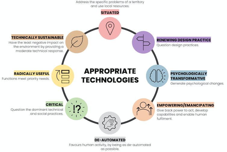 We also sought to identify the characteristics that would help define the appropriate technology approach. These include a renewal of design methods, a psychological transformation, user empowerement, a tendency to favour de-automation, as well as a taste for radical usefulness and technical sustainability.