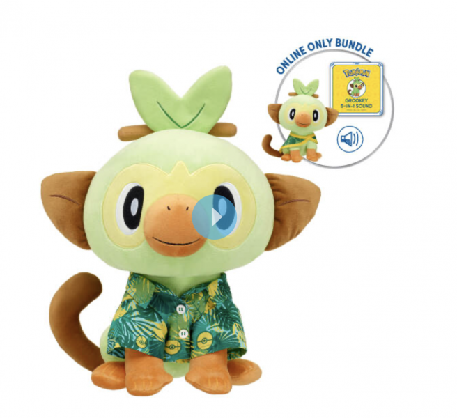 “Get into the groove with Grookey,” the site’s description of this bundle reads. “This friendly Pokémon is sure to always stick by your side. The curious Grookey is a Grass-type Pokémon with green fur, large eyes and ears, and a curly brown tail. Pokémon trainers will love this exclusive Grookey plush toy bundle, which includes Grookey’s leaf print shirt, matching cape, and 5-in-1 sound chip.”