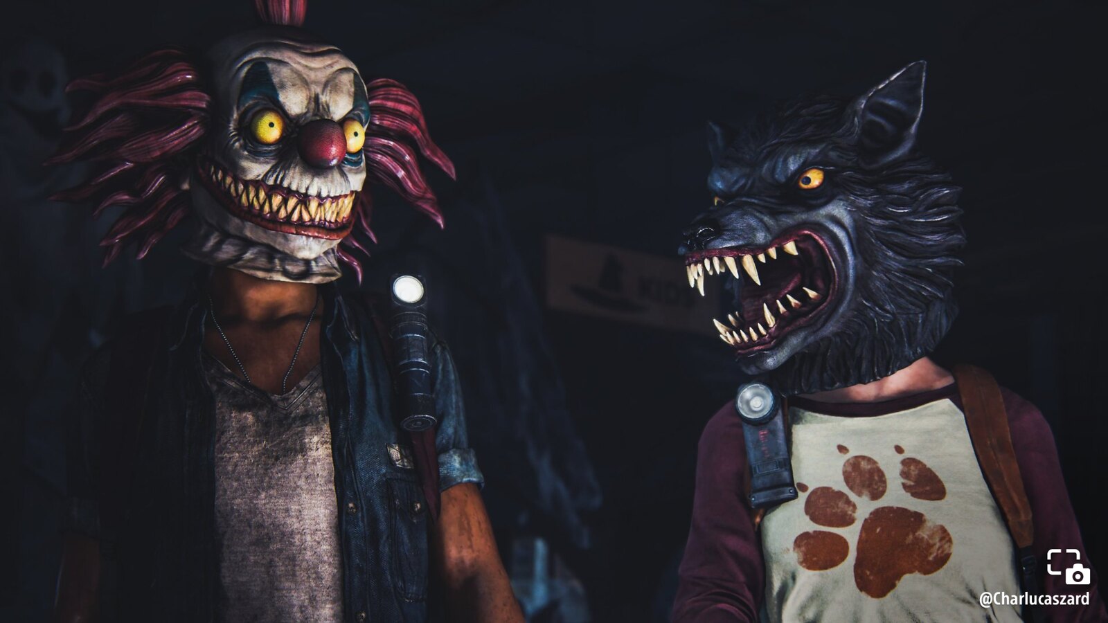 Charlucaszard shares Riley and Ellie wearing evil clown and werewolf Halloween masks.
