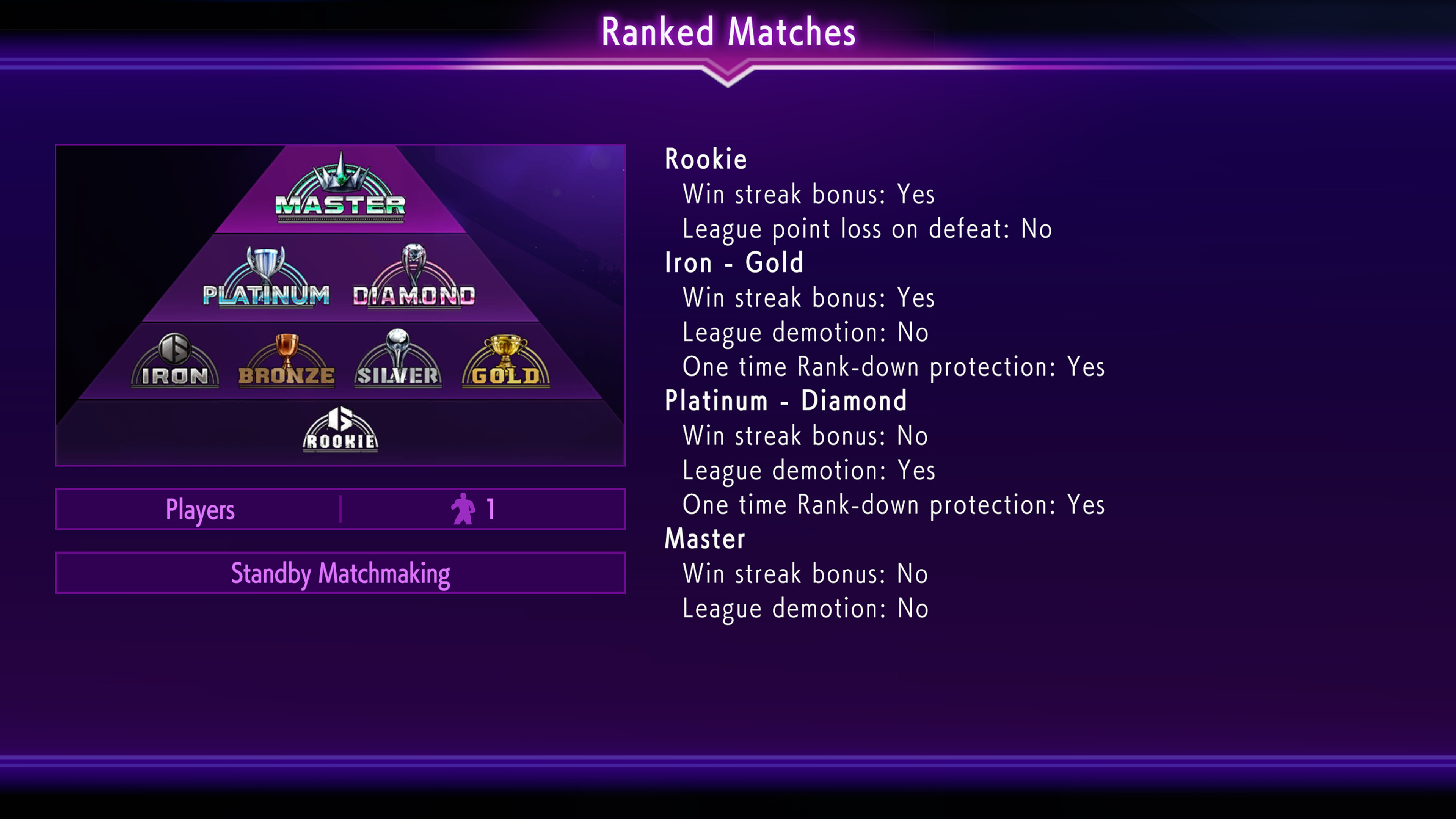 Ranked Matches return where you can fight against other players worldwide and earn League Points to rank up. We’ve taken steps to reduce the fear of losing a match in certain Ranks. First, there’s a one-time Rank-down protection feature for those ranked in Diamond and below. To encourage online play, Rookies will no longer lose League Points upon defeat. Finally, Iron-Gold and Master-ranked players will not incur League demotions. Each character also has their own individual Rank, so trying a new character in a Ranked Match is easier than ever. We hope you take advantage of these features to improve your gameplay!