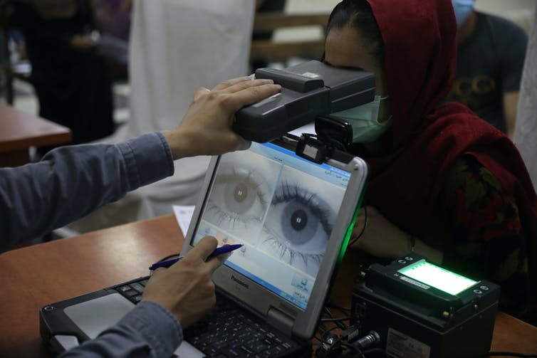 Before falling to the Taliban, the Afghan government made extensive use of biometric security, including scanning the irises of people like this woman who applied for passports.