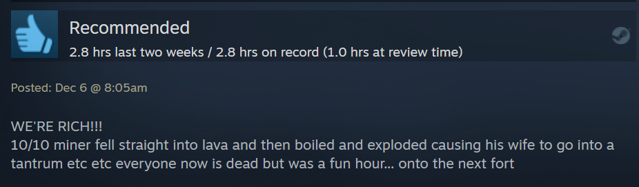 TuGun Jr.: “Been playing for some time now and finally got it on steam. I started an embark next to a river and my miner spawned in and drowned without me realizing for the first couple of minutes until i saw dwarves were horrified. 11/10 would embark again.”