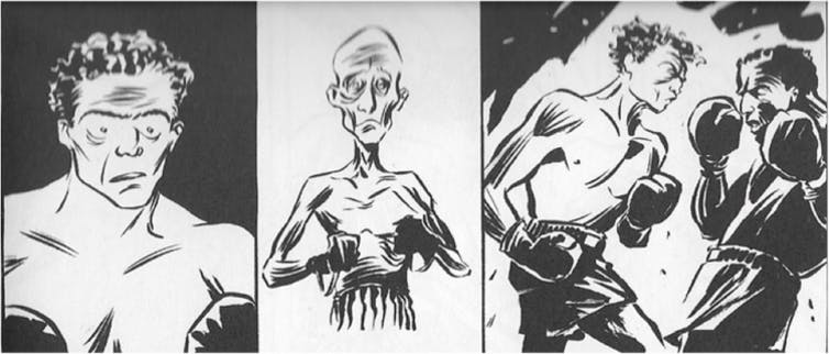 In this black-and-white cartoon, Haft tells his horrific story, in which he and other concentration camp inmates were made to box each other to the death. The story is written from Haft’s perspective; interspersed throughout the narrative are panels of flashbacks depicting Haft’s memories of important personal events.