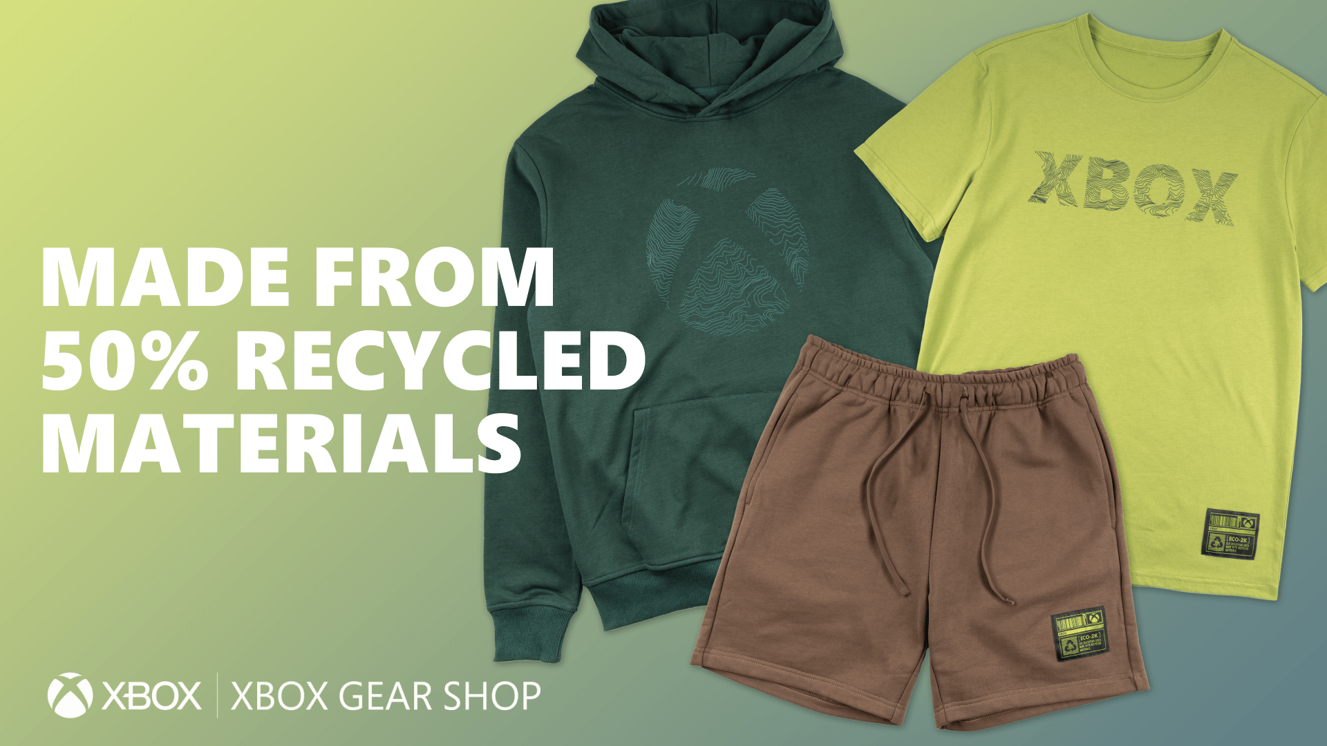 Check out the latest Xbox Gear featuring colors and topographical lines pulled straight from the Xbox Wireless Controller – Remix Special Edition. This collection features a selection of premium, ECOLIFE cotton garments. The garments are made of 50% recycled yarn and 50% BCI (Better Cotton Initiative– the world’s leading sustainability initiative for cotton). The raw materials are cut & sewn in Los Angeles, garment dyed to match the special edition Xbox controllers, printed with eco-friendly inks and packaged with biodegradable poly bags. These ECOLIFE cotton garments are available as a t-shirt, pullover hoodie and sweat shorts.
